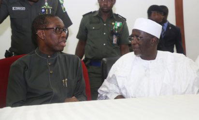 . Delta State Governor, Senator Ifeanyi Okowa (left) and former Governor of Sokoto State, Alhaji Attahiru Bafarawa, during a consultation stakeholder meeting between Governor Bafarawa and the Delta State PDP Party members, in Government House Asaba.