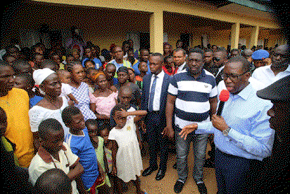 Delta State Governor, Senator Ifeanyi Okowa (right), flanked by the Commissioner, Bureau for Special Duties, Barr. Ernest Ogwezzy, addressing victims of the current flood at One Primary School holding camp in Asaba.