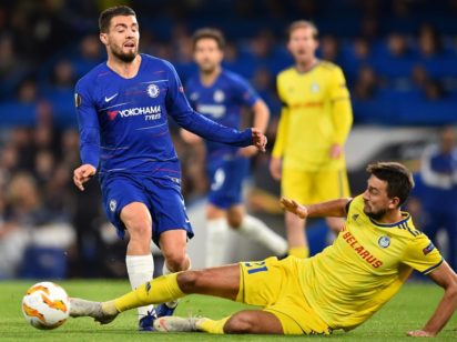 BATE Borisov’s Belarusian defender Egor Filipenko (R) tackles Chelsea’s Croatian midfielder Mateo Kovacic during the UEFA Europa League Group L football match between Chelsea and Bate Borisov at Stamford Bridge in London on October 25, 2018. (Photo by Glyn KIRK / AFP)Group A