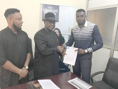 Chairman, Sugarland Villa Homes, Emmanuel Ifejika (m) handing over the ambassadorial endorsement to Ifezue Emmanuel (r) while another watches