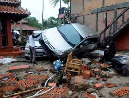 Debris from buildings and damaged cars are seen in Anyer, Serang on December 23, 2018, after the area was hit by a tsunami on December 22 following an eruption of the Anak Krakatoa volcano. – A volcano-triggered tsunami has left at least 222 people dead and hundreds more injured after slamming without warning into beaches around Indonesia’s Sunda Strait, officials said on December 23, voicing fears that the toll would rise further. ( AFP)