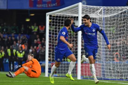 Chelsea’s Spanish striker Alvaro Morata (R) celebrates with Chelsea’s Spanish midfielder Pedro (C) after scoring the opening goal of the English Premier League football match between Chelsea and Crystal Palace at Stamford Bridge in London on November 4, 2018. (Photo by Ben STANSALL / AFP)