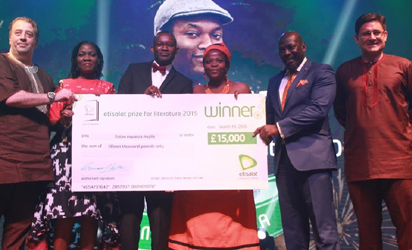 Chief Marketing Officer, Etisalat Nigeria, Francesco Angelone; Etisalat Prize for Literature Judge, Molara Woods; Winner, 2015 Etisalat Prize for Literature, Fiston Mwanza Mujila; Etisalat Prize for Literature Judge, Zukiswa Wanner; the Chair of Judges, Etisalat Prize for Literature, Prof. Ato Quayson and the Chief Executive Officer, Etisalat Nigeria, Matthew Willsher with the cheque of 15,000 BP presented to Mujila at the Awards Ceremony of the 2015 Etisalat Prize for Literature in Lagos at the weekend.