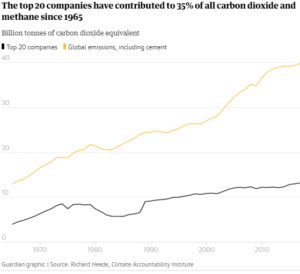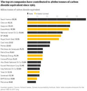 The top 20 companies on the list have contributed to 35% of all energy-related carbon dioxide and methane worldwide, totalling 480bn tonnes of carbon dioxide equivalent (GtCO2e) since 1965.
