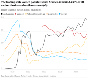 Twelve of the top 20 companies are state-owned and together their extractions are responsible for 20% of total emissions in the same period. The leading state-owned polluter is Saudi Aramco, which has produced 4.38% of the global total on its own.