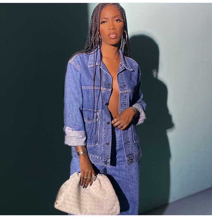 Tiwa in this new photo went braless under her denim jacket. The singer paired her denim top with matching denim pants.