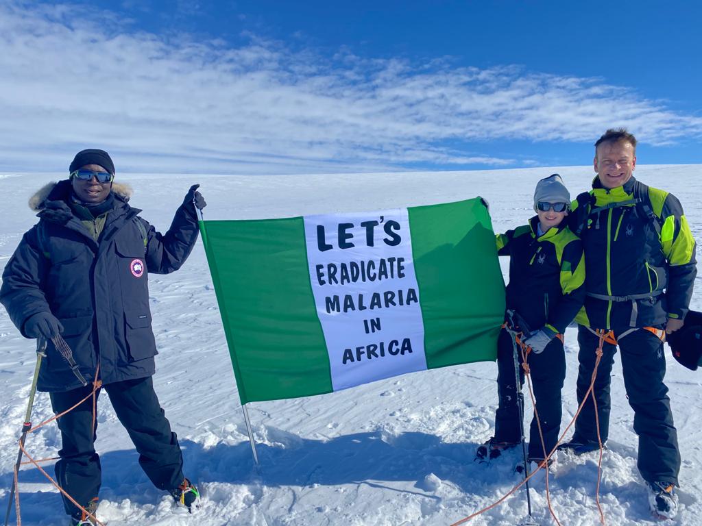 From Left: Prince Ned Nwoko (First Nigerian to visit SouthPole), Giles Harding and Captain Hamish Harding holding Nigeria flag together in support of Prince Ned Nwoko foundation on eradication of malaria in Africa.