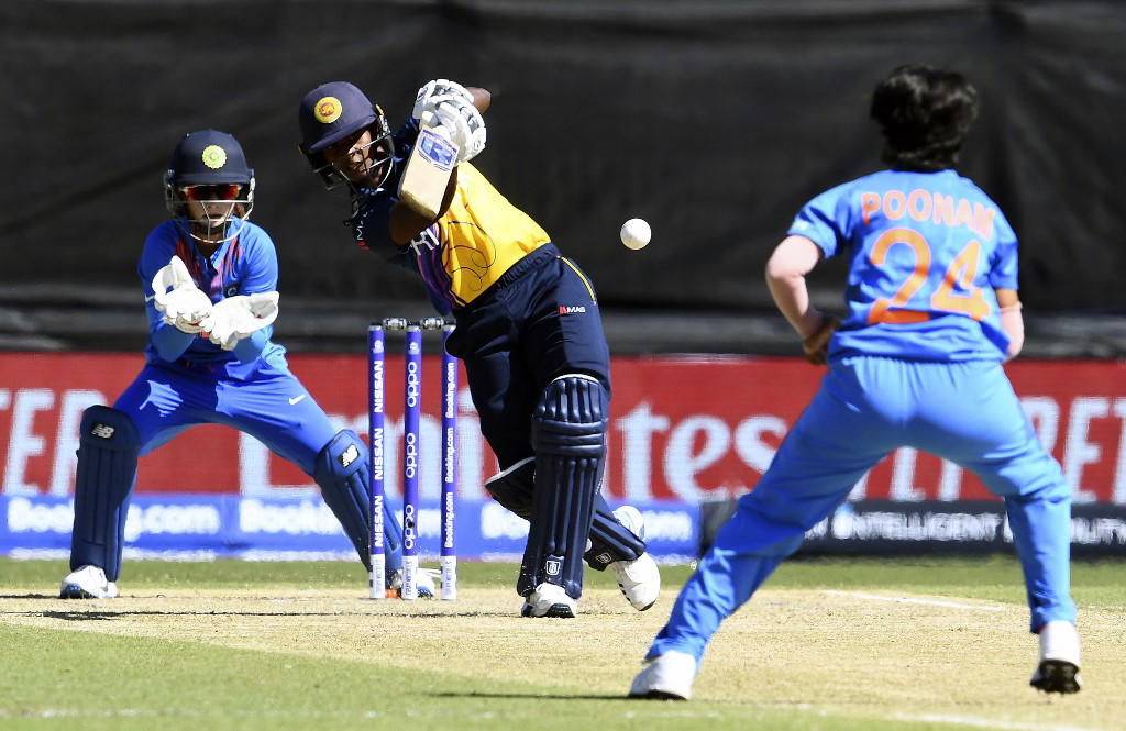 Sri Lanka batswoman Hansima Karunaratne (C) hits a delivery from India’s Poonam Yadav (R) as wicketkeeper Tanya Bhatia (L) looks on during their Twenty20 women’s World Cup cricket match in Melbourne on February 29, 2020. (Photo by WILLIAM WEST / AFP) / — IMAGE RESTRICTED TO EDITORIAL USE – STRICTLY NO COMMERCIAL USE —