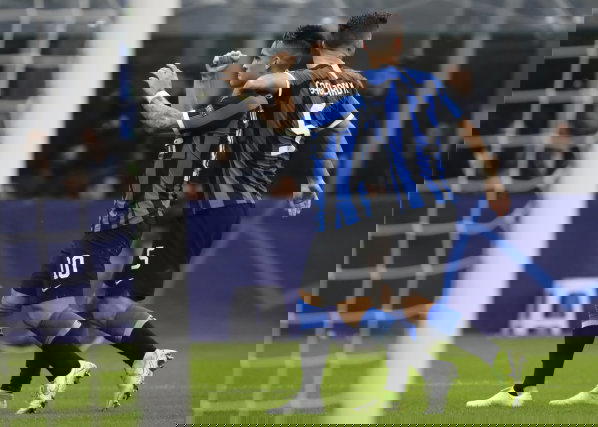 Inter Milan’s Lautaro Martinez, left, celebrates his opening goal with Inter Milan’s Roberto Gagliardini during the Champions League, Group F soccer match between Inter Milan and Borussia Dortmund at the San Siro stadium in Milan, Italy, Wednesday, Oct.23, 2019. (AP Photo/Antonio Calanni)