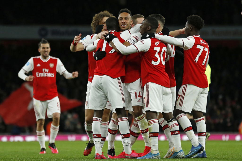 Arsenal’s Gabonese striker Pierre-Emerick Aubameyang (C) celebrates with teammates after scoring the opening goal of the English Premier League football match between Arsenal and Newcastle United at the Emirates Stadium in London on February 16, 2020. (Photo by Ian KINGTON / AFP) / RESTRICTED TO EDITORIAL USE. No use with unauthorized audio, video, data, fixture lists, club/league logos or ‘live’ services. Online in-match use limited to 120 images. An additional 40 images may be used in extra time. No video emulation. Social media in-match use limited to 120 images. An additional 40 images may be used in extra time. No use in betting publications, games or single club/league/player publications. /