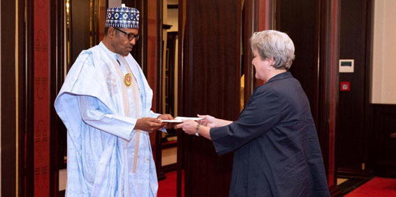 Ambassador Leonard presenting her credentials to President Muhammadu Buhari on December 24, 2019.