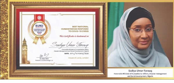 In her acceptance speech, Minister Sadiya Umar Farouq thanked  Euro-Knowledge, one of the world’s leading international consultancy firms and organizers of the awards for deeming her worthy of the award. This,  she said has validated  Federal government’s efforts in effectively combating and curbing the economic effects of Covid-19 on Nigerians.