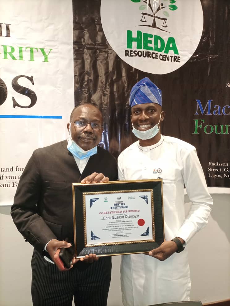 The Human and Environmental Development Agenda (HEDA Resource Centre) has recognized the effort and contribution of Olawoyin Edris Busayo to society as he received the Certificate of Award at the 3rd Annual Gani Fawehinmi Integrity and Impact Awards.