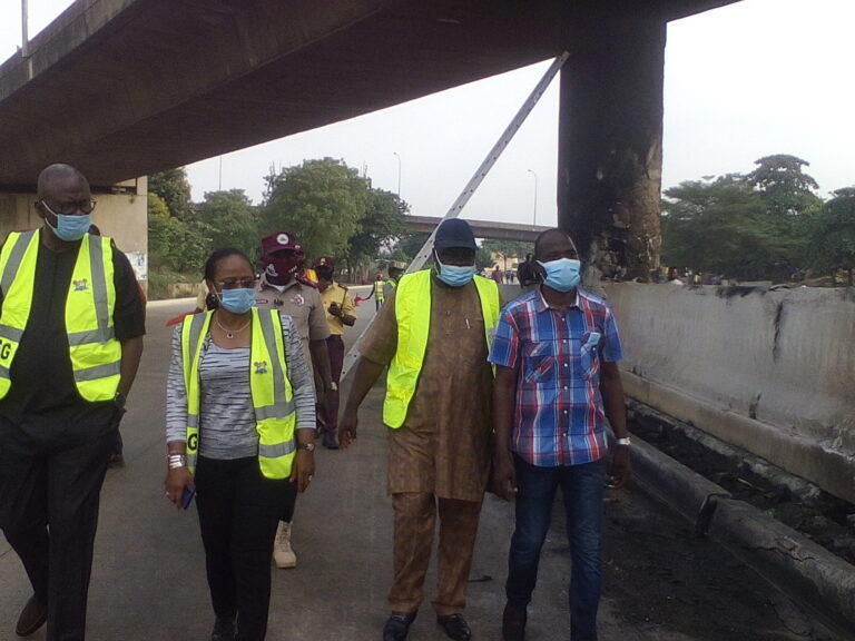 Permanent Secretary, Lagos State Ministry of Works and Infrastructure, Mr Olujimi Hotonu; Special Adviser to Gov. Babajide Sanwo-Olu on Works and Infrastructure, Mrs Aramide Adeyoye; Federal Controller of Works in Lagos, Mr Olukayode Popoola, and Senior Engineer, Mr Aliu Oyewande, during inspection of Airport Road Flyover and a section of Apapa-Oshodi-Ojota-Oworonshoki Expressway damaged by fire, on Friday in Lagos (NAN photo)