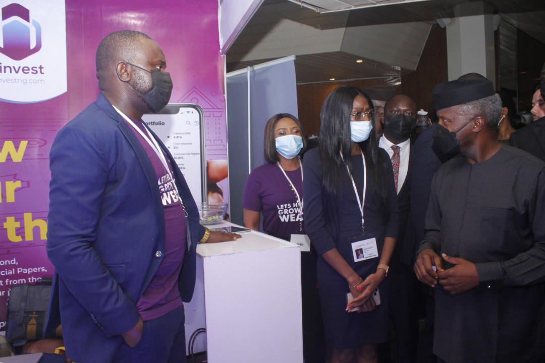 From left: Franklyne Ikediasor, Product Marketing Manager I-invest, Jennifer Omame, Product Manager, I-invest, Ibilola Ashcroft, Vice President, Operations, I-invest, His Excellency, Professor Yemi Osinbajo, GCON, SAN, Vice President, Federal Republic of Nigeria and Asue Ighodalo, Chairman, Nigeria Economic Summit Group discussing investment opportunities at the I-invest booth during the 27th Nigerian Economic Summit at the Transcorp Hilton, Abuja.