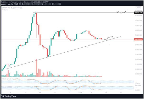 HUH Token looks to continue its uptrend after its explosive launch on December 6. HUH bounced off of the $0.0001000 support level confirming the uptrend. Since then, the price increased and is currently trading in a narrow band between $0.0002000 and $0.00016010.