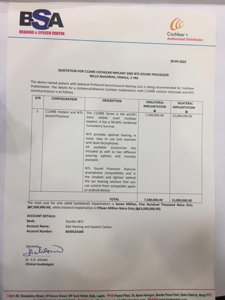 Mr Bello noted the specialist further recommended amplification fittings, that is, Cochlear implantation and speech therapy programme for her to regain her hearing.