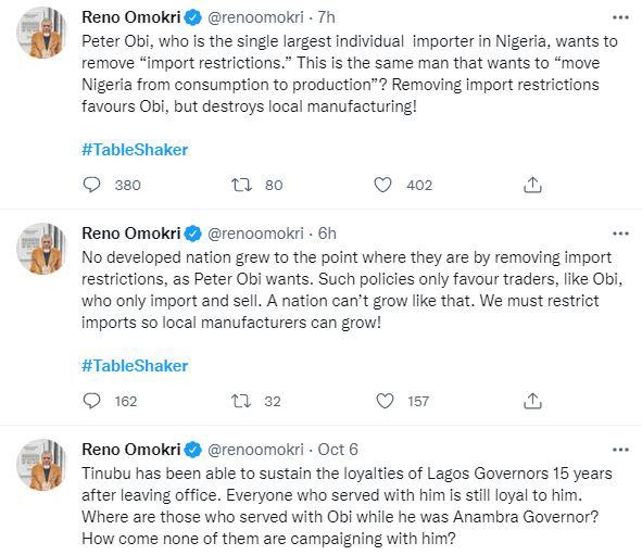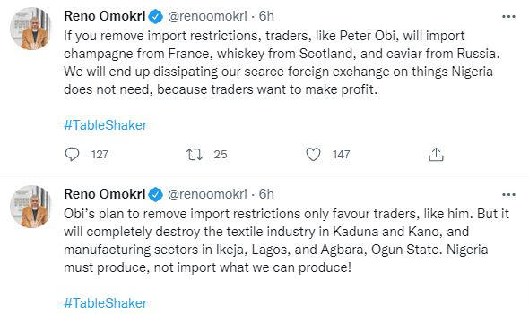 “Peter Obi, who is the single largest individual importer in Nigeria, wants to remove “import restrictions.” Yet, this is the same man that wants to “move Nigeria from consumption to production”? Removing import restriction favours traders, like Obi, but destroys local manufacturing!