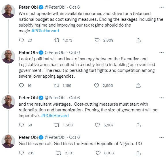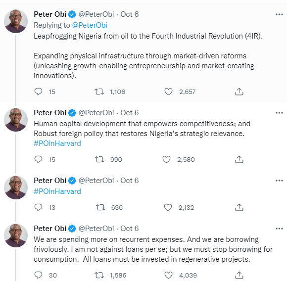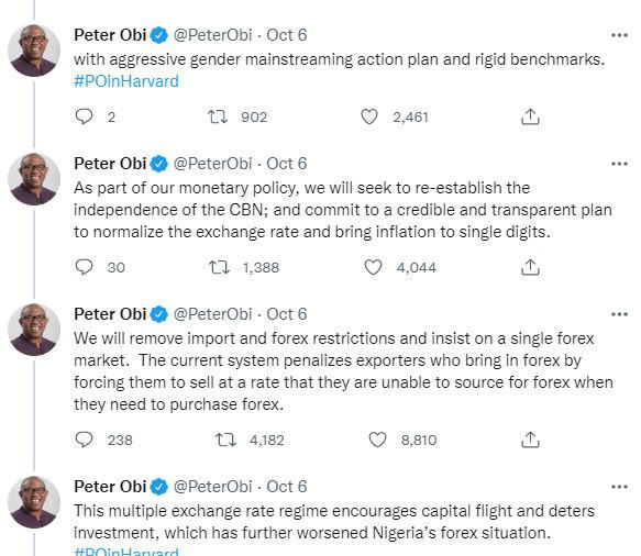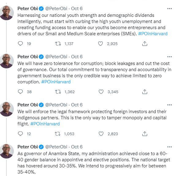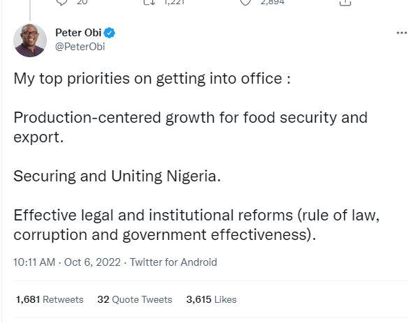 Also in a series of tweets, Peter Obi said his top priorities on getting to office should he emerge Nigeria’s president are “production-centered growth for food security and export, security and uniting Nigeria and effective legal and institutional reforms (Rule of law and government effectiveness).”