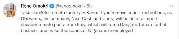 “Take Dangote Tomato Paste factory in Kano. If you remove import restrictions, as Obi proposes, his company, Next Cash and Carry, will be able to import cheaper tomato paste from Italy, which will force Dangote Tomato out of business and make thousands of Nigerians he employs unemployed.