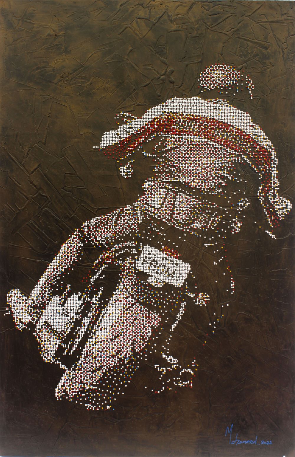 Mohammed is a self-taught artist who spent a period of 12 years in the banking industry before leaving in 2015 to concentrate on art, which he does passionately. He works in a variety of media including painting and drawing with acrylic and oil, until recently when he focused on using 3-dimensional objects. Among his favourite materials are cotton buds, pushpins, screw, nails, bottle tops, drilling on woods and plastics to make amazing artworks.