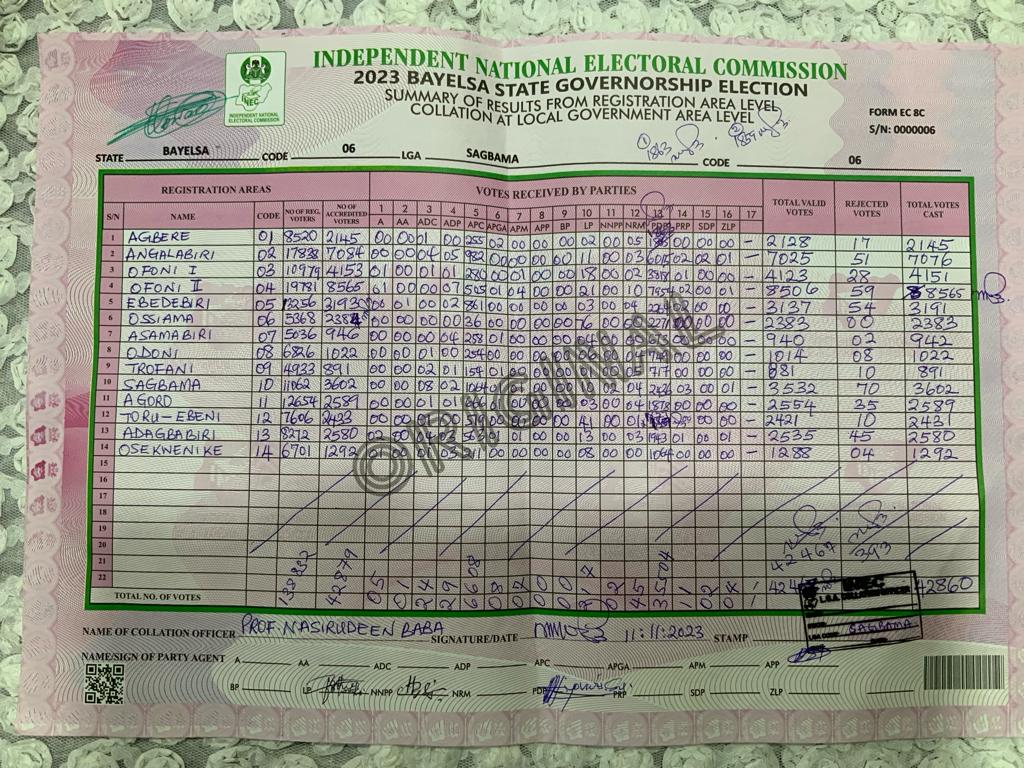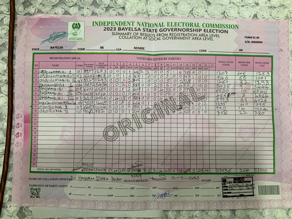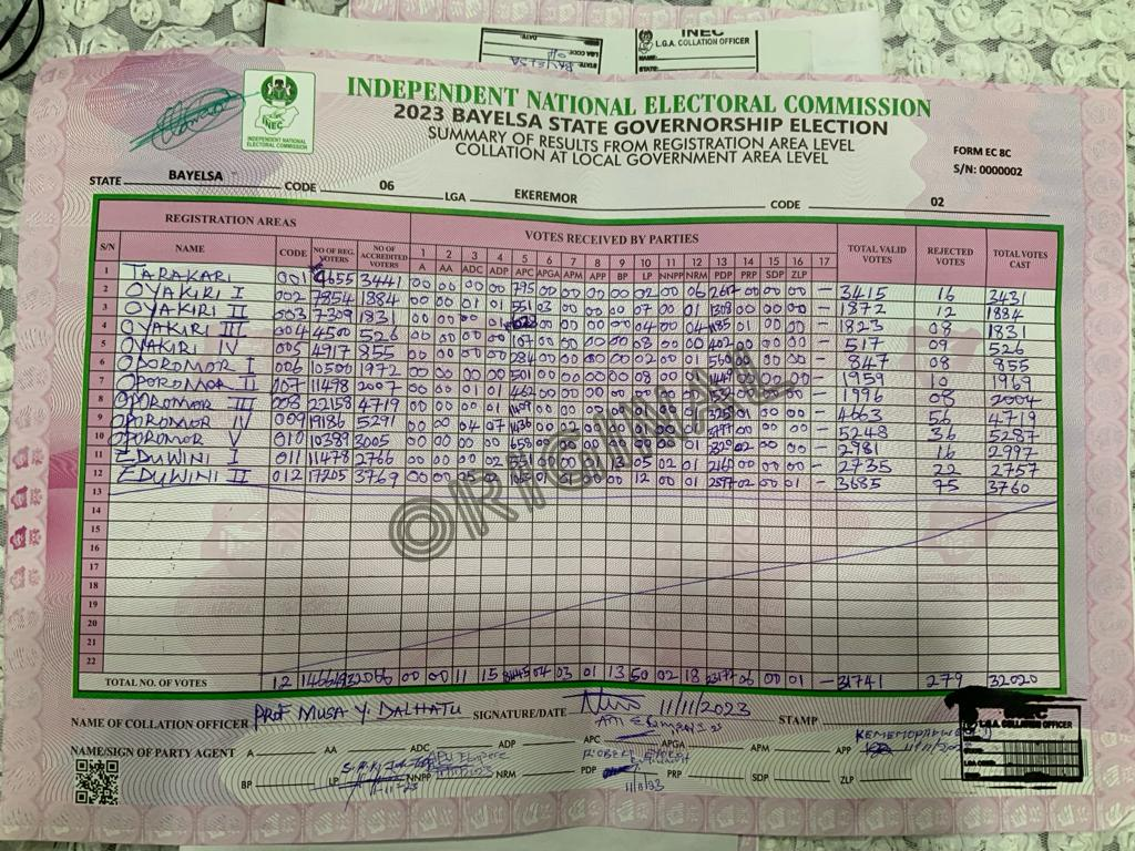 Meanwhile, the results for Brass and Southern Ijaw LGAs are still been awaited as the State Returning Officer and Vice-Chancellor, Federal University of Technology, Minna, Prof Farouk Kuta, has adjourned the collation.