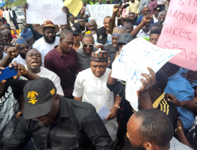 Vanguard gathered that the SDP candidate and his aggrieved supporters went to the INEC headquarters to express their displeasure with the conduct and outcome of the election.