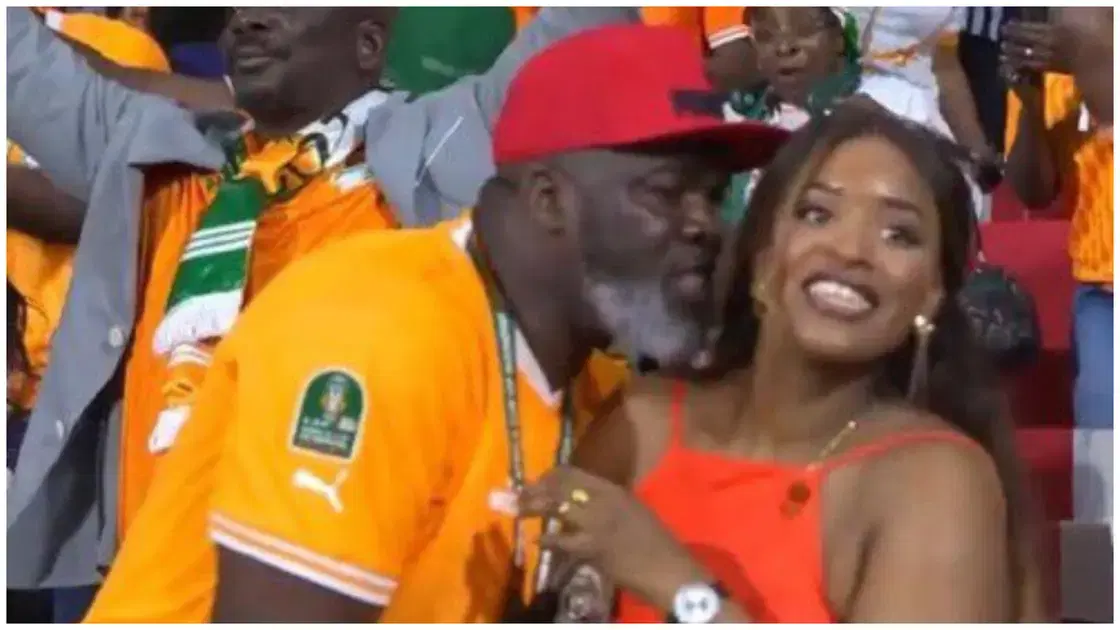 The Ivorian fan was spotted in the stands during his country’s epic AFCON victory over the defending champions, preferring to ignore the stadium’s raucous celebrations in favor of speaking with a young woman standing next to him.