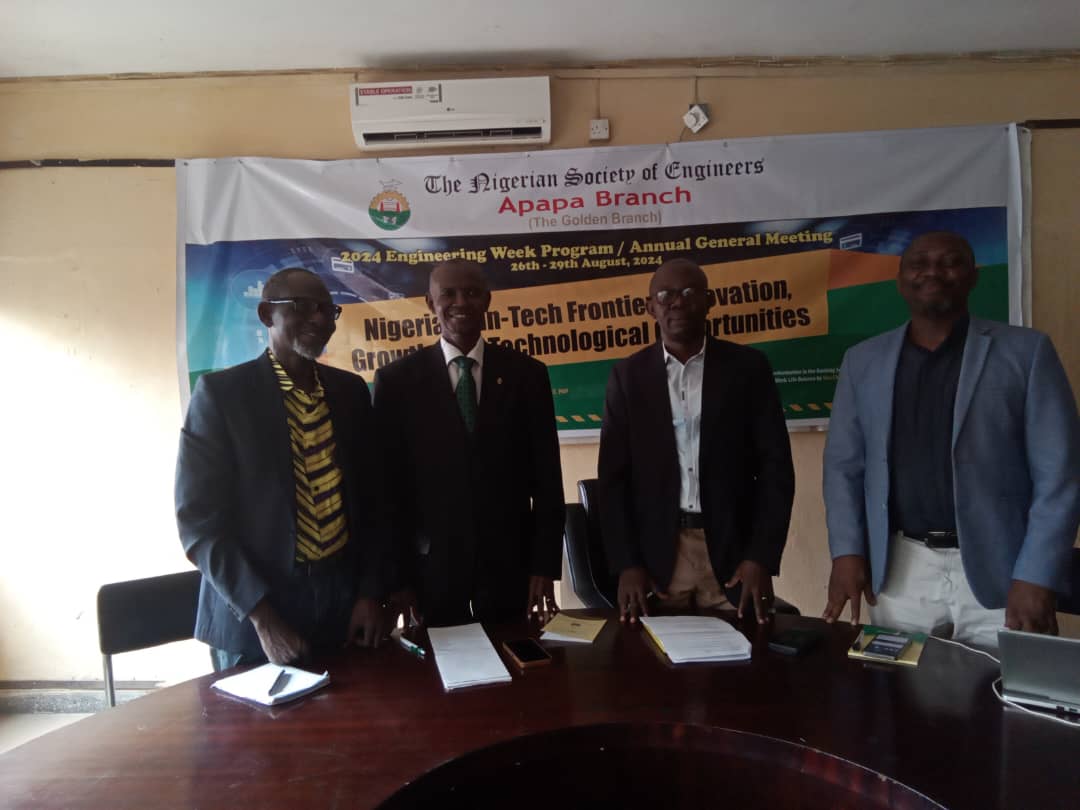 Third left: Engr. Emmanuel Okolo( Vice Chairman, NSE Apapa branch, representing the chairman, Engr. Babatunde Awode; flanked by the immediate past chairman, Engr. Christian Ufot, and Engr. Ajadi S.A, and at the far right, Engr. Malvin Ibisi, NSE Apapa Secretary at the press briefing for 2024 Engineering Week.
