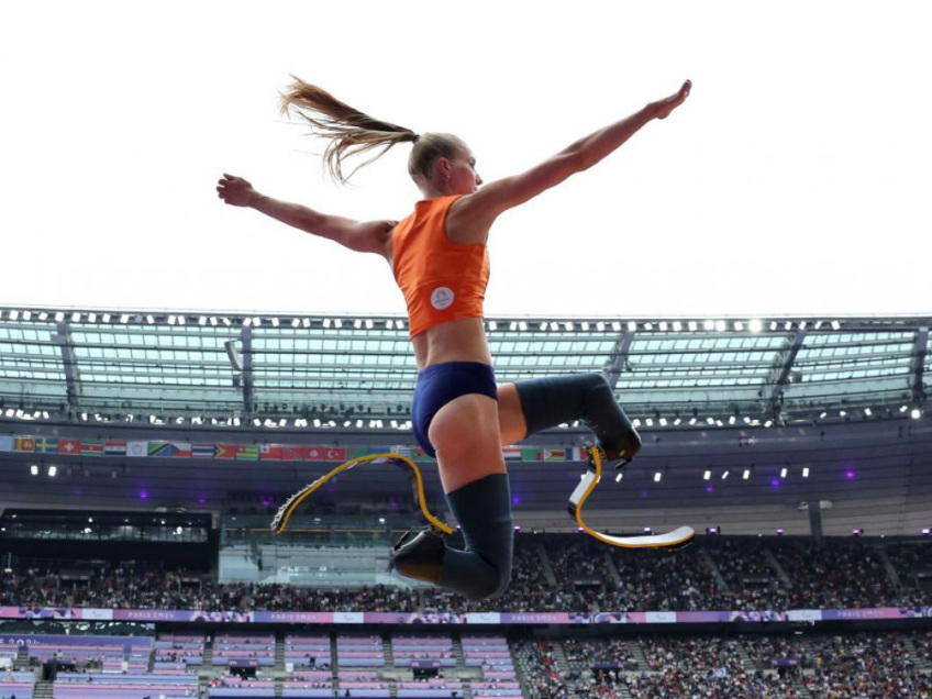 Netherlands’ Fleur Jong beat her own Paralympic record to clinch gold in the women’s long jump T64 final.