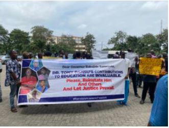 The union members carried placards with inscriptions such as: “Dear Governor Babajide Sanwo-Olu, Dr Tony Dansu’s Contributions to Education are Invaluable, Release, Reinstate Him and Others and Let Justice Prevail“.