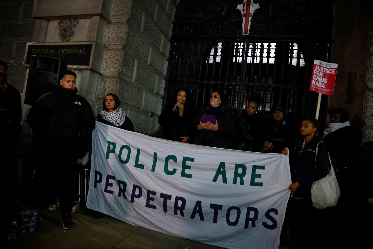 Protesters gather outside the Old Bailey after the verdict of not-guilty against a police officer accused of the murder of Chris Kaba, a rap singer shot dead in Streatham Hill on September 5, 2022, in London on October 21, 2024. – A UK police marksman was on Monday cleared of murdering a black man who was shot dead two years ago as officers tried to stop a car he was driving in south London. Martyn Blake, 40, had been on trial for killing Chris Kaba, 24, in the Streatham area of the British capital in September 2022. He died of a single gunshot to the head. (Photo by BENJAMIN CREMEL / AFP)