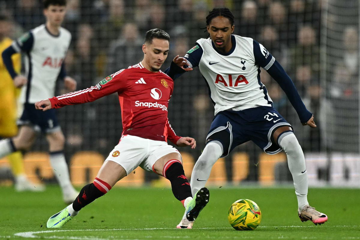 Manchester United’s Brazilian midfielder #21 Antony (L) vies with Tottenham Hotspur’s English defender #24 Djed Spence during the English League Cup quarter-final football match between Tottenham Hotspur and Manchester United at the Tottenham Hotspur Stadium in London, on December 19, 2024. (Photo by Ben STANSALL / AFP)