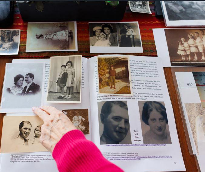 Holocaust survivor Gershon Willinger’s wife Jane points to family photos, spread out on his dining room table at their home in Toronto, Ontario, Canada, on January 12, 2025. Photo: Cole BURSTON / AFP