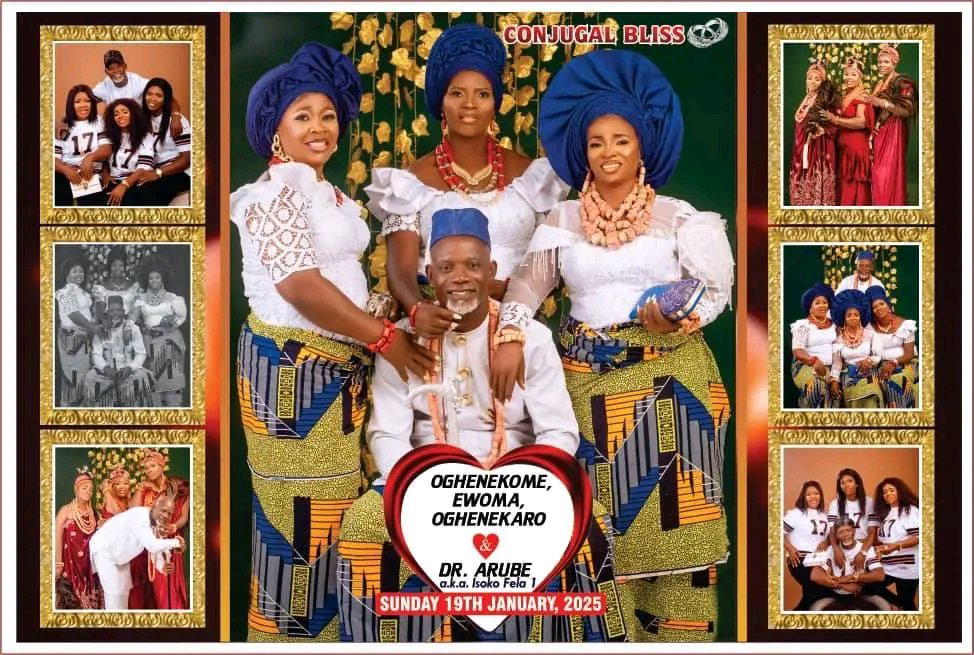 As seen in a viral flier, Dr. Arube is seen dressed in matching attire with his three soon-to-be wives: Oghenekome, Ewoma, and Oghenekaro, all hailing from Delta State.