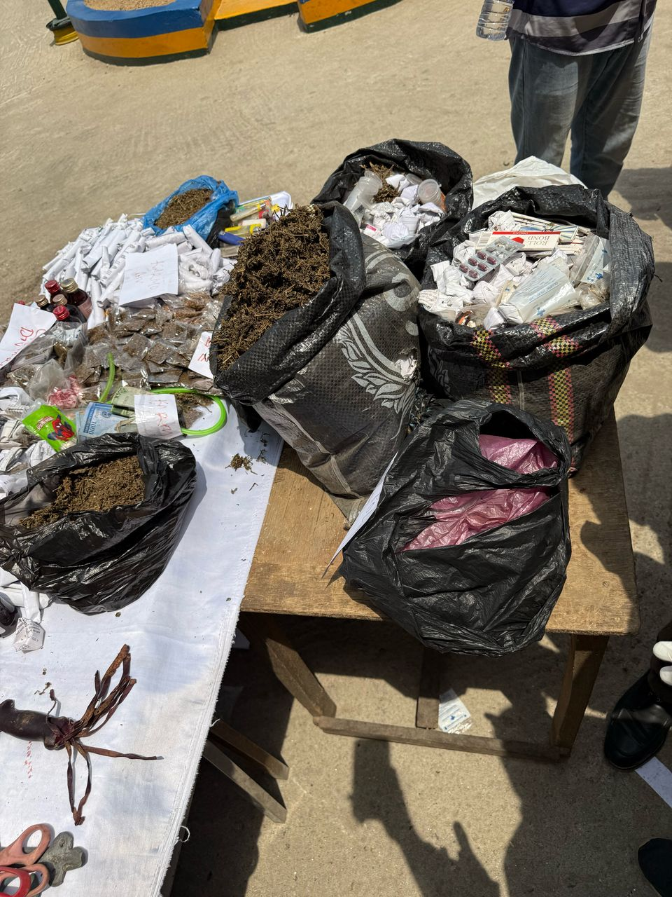 Several small packages containing dried leaves suspected to be marijuana, Large quantities of small glue tubes (inhaled as intoxicants), Large bags containing dried leaves suspected to be marijuana, Several locally made bongs, Cash sum of twenty-eight thousand, fifty naira (N35,050) and Several cards of Rohypnol