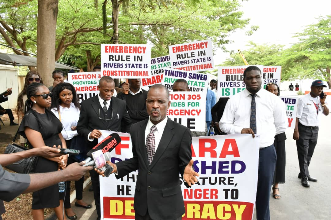 Inscriptions on some of the placards brandished by the legal practitioners reads “Emergency rule in Rivers State constitutional”, “Section 305 provides for emergency rule”, “Emergency rule in Rivers State is legal”, “Tinubu saved Rivers from anarchy”, and “Fubara demolished the legislature, is is a danger to democracy”