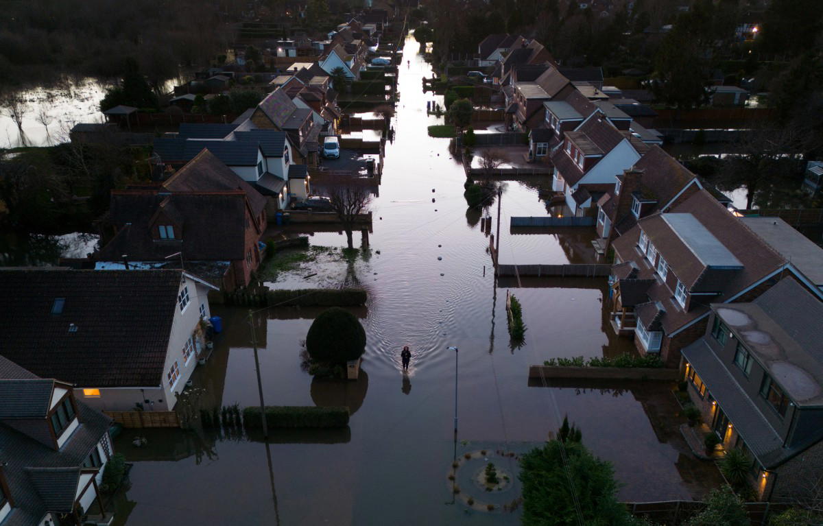 (FILES) An aerial view shows people walking through floodwater surrounding homes and houses on a residential street in Wraysbury, west of London on January 9, 2024, after heavy rain brought flooding to much of the country following Storm Henk. – Around one in five properties in England are at risk of flooding, a 15 percent increase from 2018, the Environment Agency warned December 17, 2024, using models incorporating new localised data and climate change projections. Around 6.3 million homes and businesses are located in areas at risk of flooding from one or a combination of rivers, the sea and surface water, up from 5.5 million when the last assessment was conducted in 2018. (Photo by Daniel LEAL / AFP)