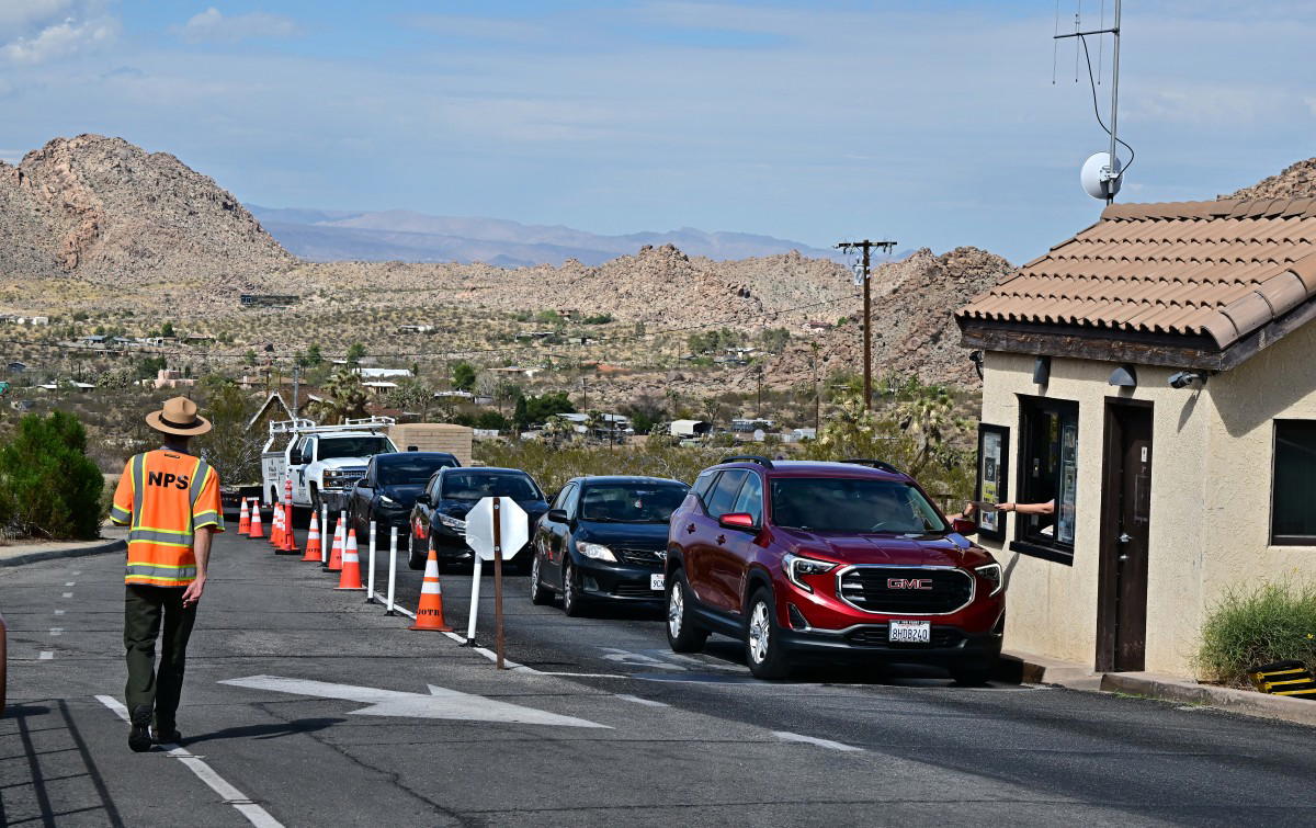 Vehicles wait in line to enter Joshua Tree National Park in California, on October 10, 2025, on the tenth day of the federal government shutdown. The US national park in southeastern California, located in both the Mojave and Colorado deserts, has remained open and accessible since the shutdown began. Some visitor services are limited or closed, with entrance fees not collected as a limited staff of maintenance personnel remain on duty. (Photo by Frederic J. BROWN / AFP)