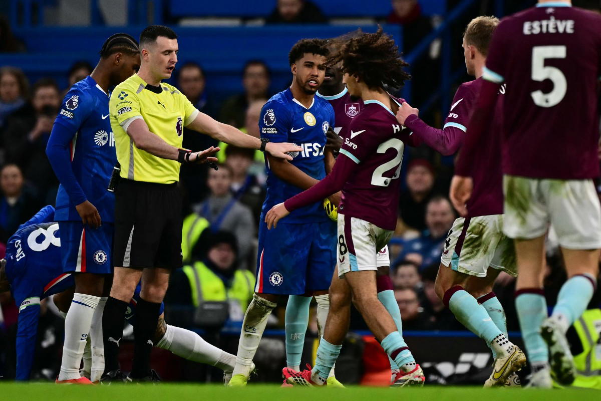Burnley’s Tunisian defender #28 Hannibal Mejbri is dragged away by a teammate during the English Premier League football match between Chelsea and Burnley at Stamford Bridge in London on February 21, 2026. (Photo by Ben STANSALL / AFP) / RESTRICTED TO EDITORIAL USE. NO USE WITH UNAUTHORIZED AUDIO, VIDEO, DATA, FIXTURE LISTS, CLUB/LEAGUE LOGOS OR ‘LIVE’ SERVICES. ONLINE IN-MATCH USE LIMITED TO 120 IMAGES. AN ADDITIONAL 40 IMAGES MAY BE USED IN EXTRA TIME. NO VIDEO EMULATION. SOCIAL MEDIA IN-MATCH USE LIMITED TO 120 IMAGES. AN ADDITIONAL 40 IMAGES MAY BE USED IN EXTRA TIME. NO USE IN BETTING PUBLICATIONS, GAMES OR SINGLE CLUB/LEAGUE/PLAYER PUBLICATIONS. /