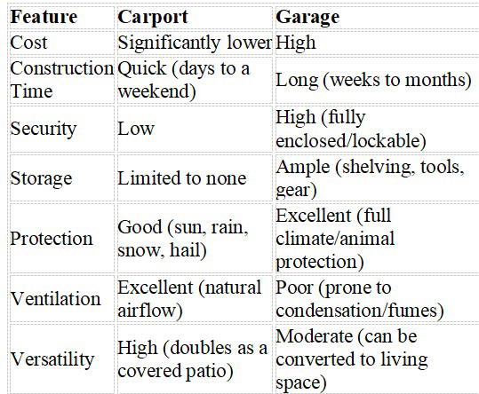 The choice between a carport and a garage is a significant one for any homeowner. Both offer protection for your vehicle, but they do so in different ways and come with their own sets of advantages and disadvantages. Here’s a detailed comparison to help you decide which is the right fit for your needs and budget: