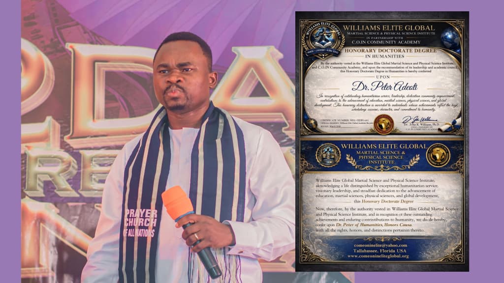 The Prayer Church of All Nations (PCOAN) family and supporters worldwide are celebrating a major milestone as Prophet Peter Adeoti, the church’s revered prophetic voice, was recently awarded an honorary Doctorate in Humanity.