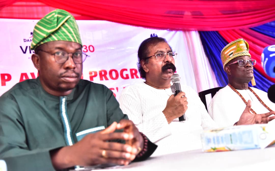 From left: Chairman, Lekki LCDA, Engr. Razaki Bamidele Kasali; Vice President, Oil and Gas, Dangote Industries Limited, Devakumar Edwin; and the Onilekki of Lekki, HRM Oba Olumuyiwa Ogunbekun, during the 6th Dangote Scholarship Award Programme and the distribution of school kits to students in Ibeju Lekki recently.
