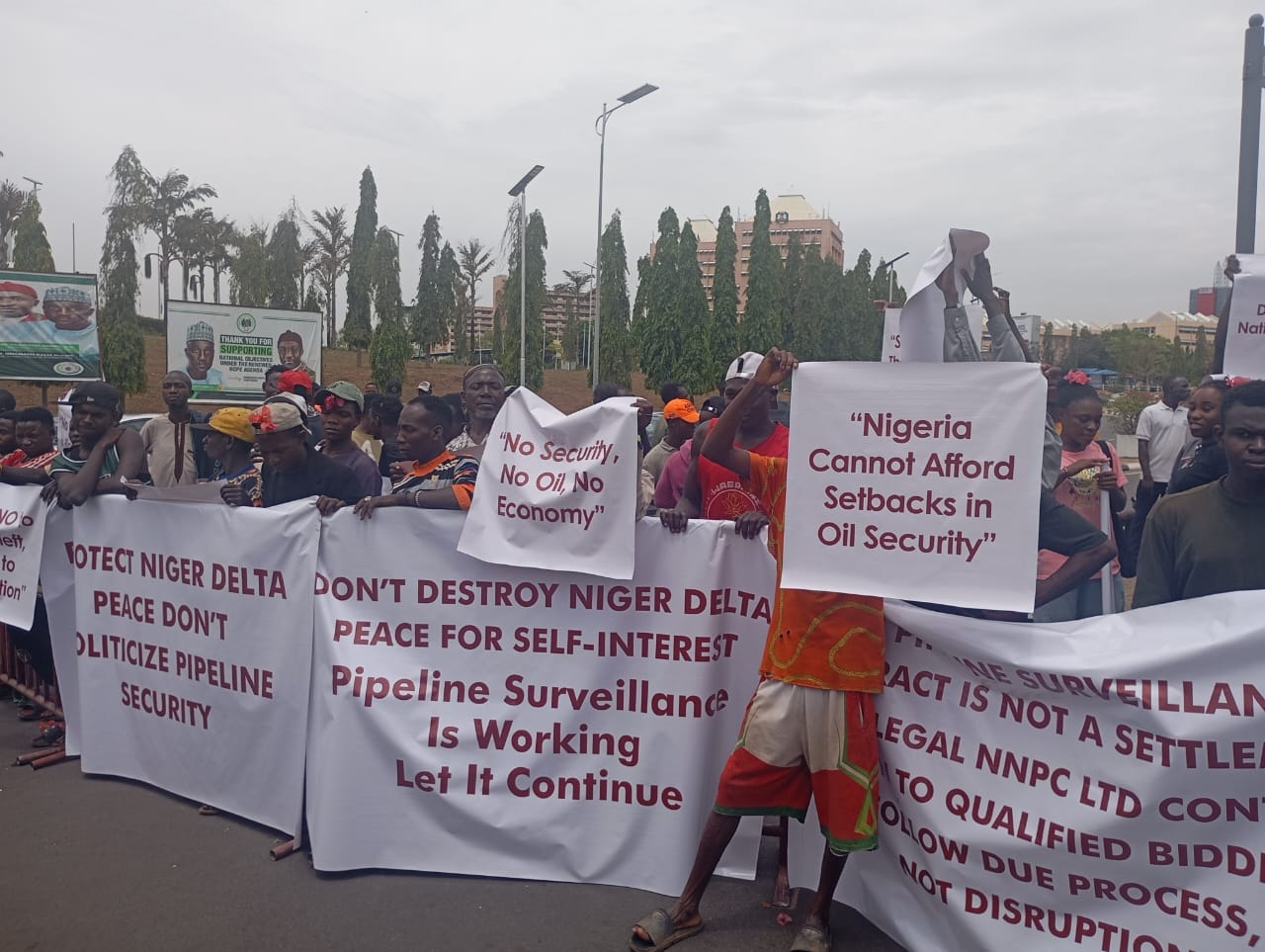 The demonstrators carried placards emphasizing the importance of stability in oil infrastructure and the Niger Delta region.