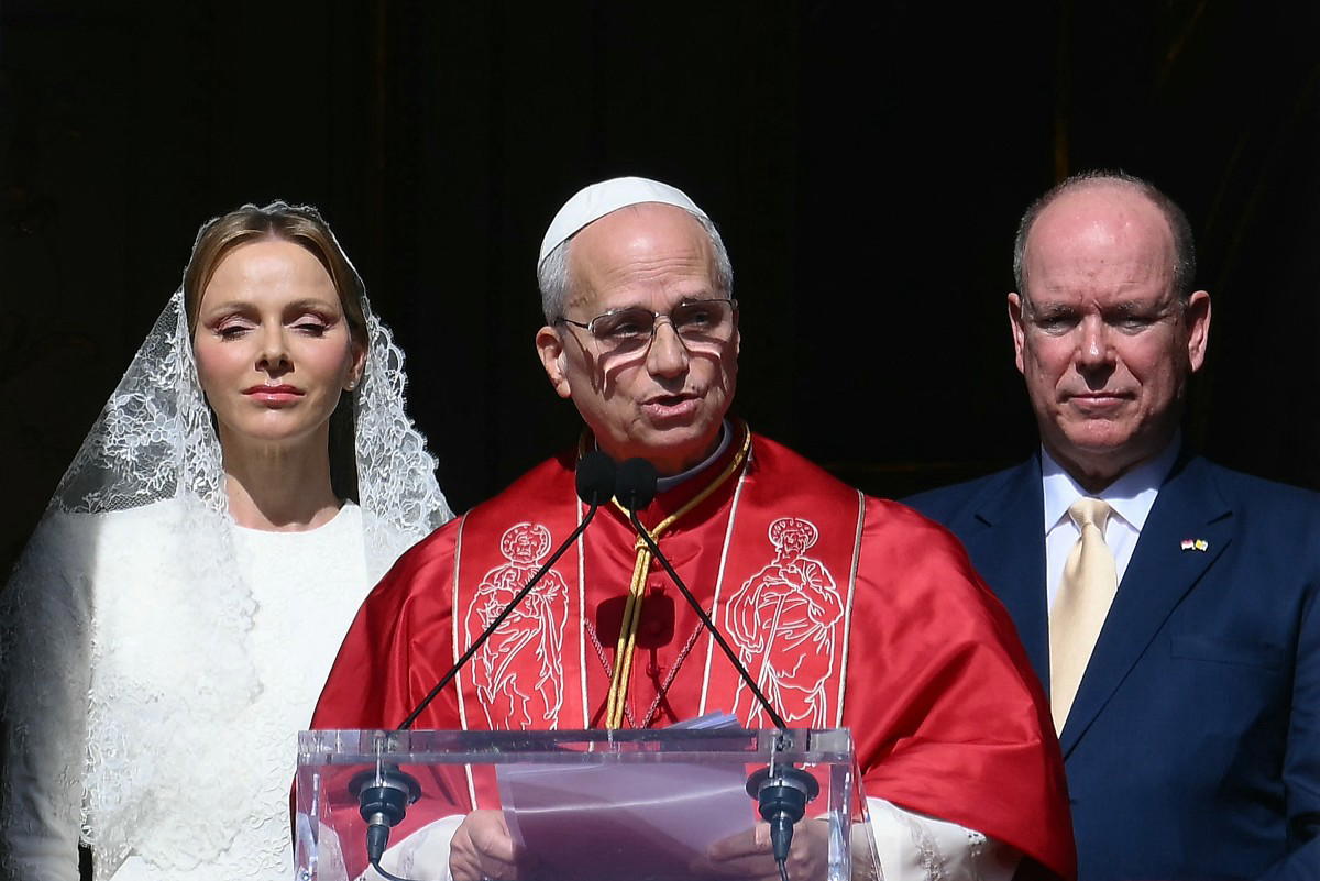 Pope Leo XIV gives a speech from the balcony next to Prince’s Albert II of Monaco (R) and Princess Charlene of Monaco at the Prince’s Palace of Monaco in Monte Carlo, Monaco, on March 28, 2026. Pope Leo XIV heads to the Mediterranean principality of Monaco on the French Riviera that is the pontiff’s surprise pick for the first western European trip of his papacy. The US-born pope, a former missionary critical of the wealthy elite, will helicopter in for a day in the world’s second-smallest state, best known for its casinos, luxury yachts and Michelin-starred dining. (Photo by Marco BERTORELLO / AFP)