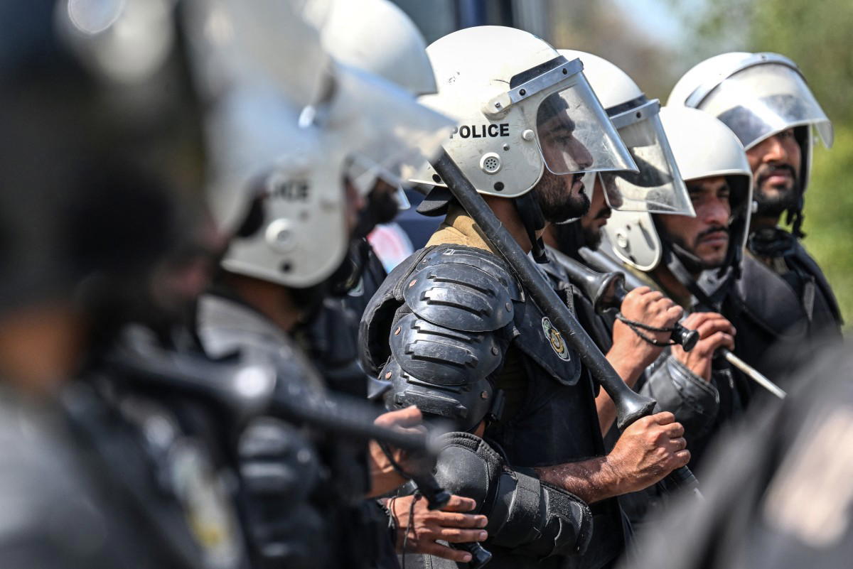 Riot policemen line up along a road near the expected venue of the US-Iran talks in the Red Zone area of Islamabad on April 10, 2026. As Iranian and US envoys prepare to hold talks in Islamabad to end the Middle East war, official sources and experts say Beijing helped pave the way for the negotiations and will be a crucial component in securing a permanent truce. (Photo by Aamir QURESHI / AFP)