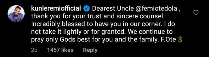 Replying Kunle Remi thanked him saying, “Dearest Uncle @femiotedola, thank you for your trust and sincere counsel. Incredibly blessed to have you in our corner. I do not take it lightly or for granted. We continue to pray only Gods best for you and the family. F.Ote.”