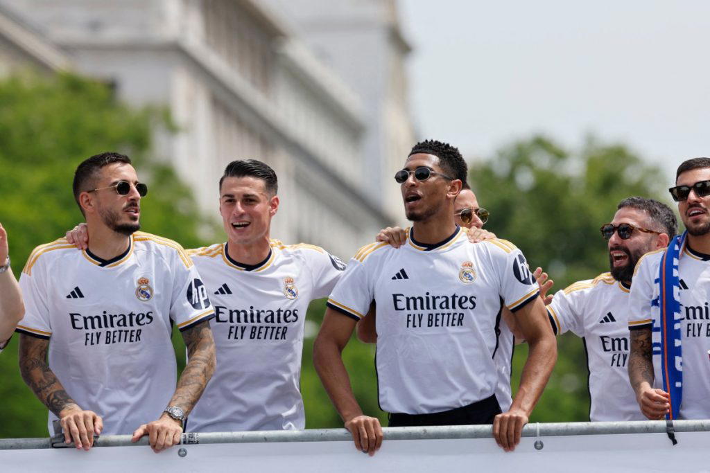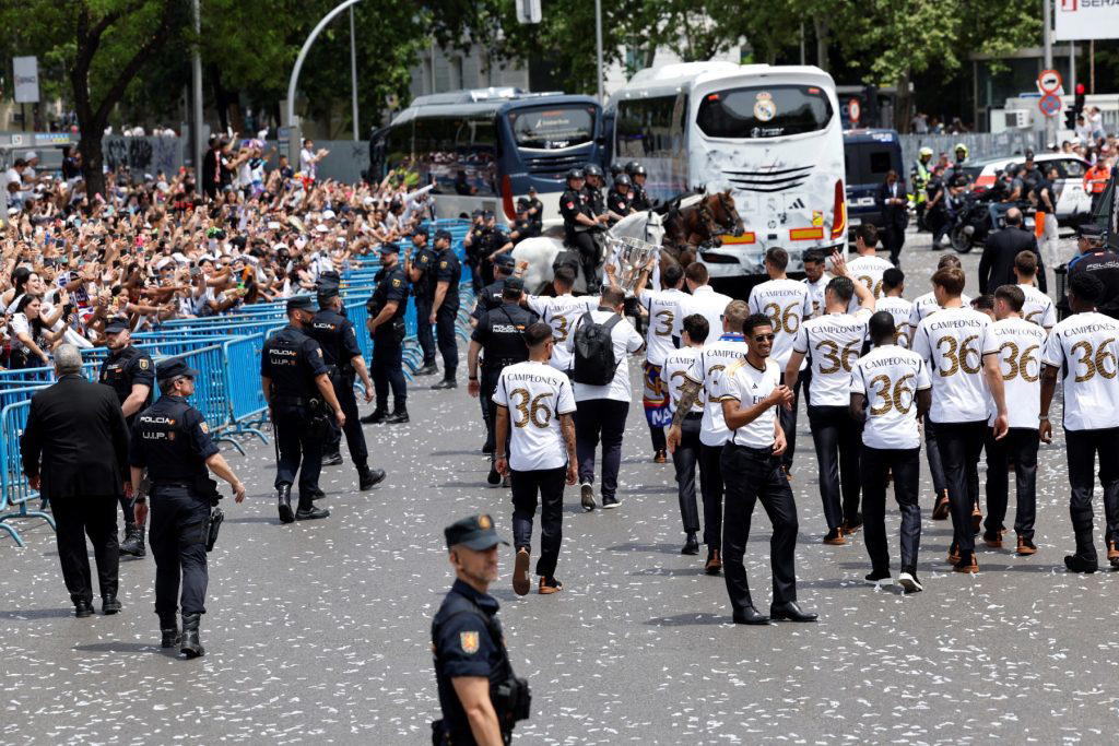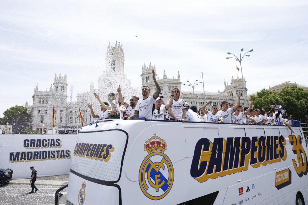 Real Madrid players parade onboard a bus as they celebrate their 36th La Liga trophy at the Cibeles square in Madrid on May 12, 2024. – Real Madrid’s fans line the streets of Madrid as ‘Los blancos’ celebrate their 36th Liga trophy before facing Borussia Dortmund at Wembley in the Champions League final on June 1. (Photo by OSCAR DEL POZO / AFP)