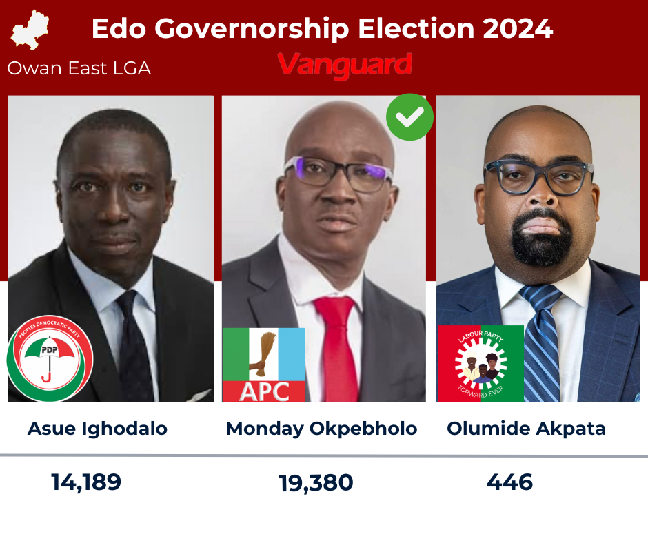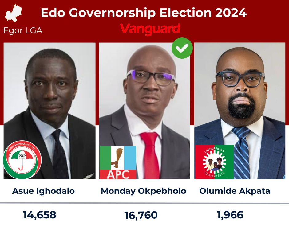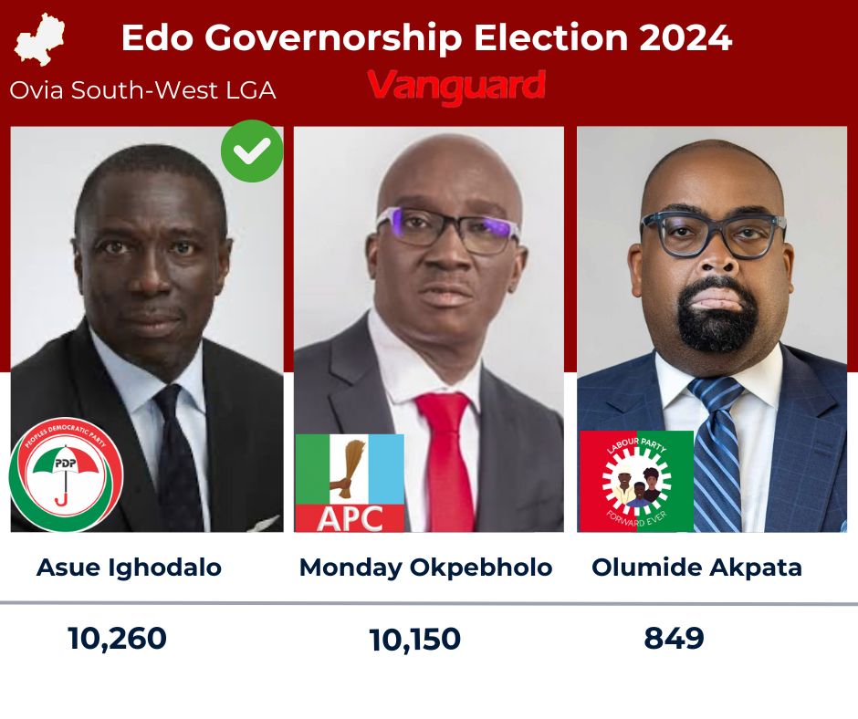 According to the results announced by the Independent National Electoral Commission, INEC, on Sunday, Okpebholo secured 244,549 votes, while Asue Ighodalo of the Peoples Democratic Party, PDP, garnered 195,954 votes. Olumide Akpata of the Labour Party, LP, got a total of 13,348 votes.