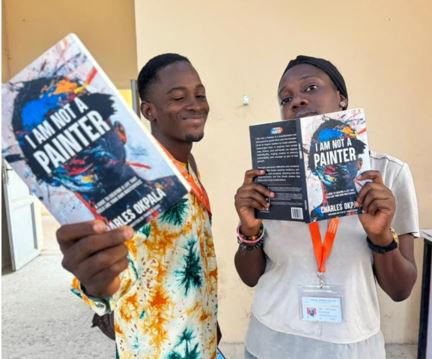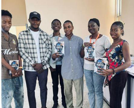 Students of Federal University Lafia gather with copies of I Am Not A Painter during a vibrant session of “The I Am Not A Painter School Project,” highlighting a shared commitment to creative growth and self-discovery.